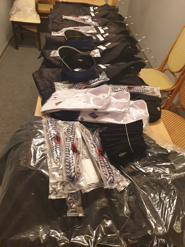 - zakup elementów munduru reprezentacyjnego (czapka rogatywka 25 szt., mundur męski, na który składają się marynarka i spodnie 20 kompletów, koszula 25 szt., sznur i pagony do koszuli 20 kompletów, krawat 20 szt., sznur galowy 20 szt.)